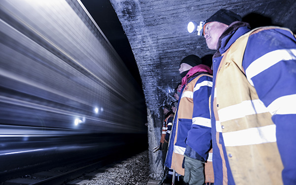 作業(yè)完成后,工人在隧道避車洞內(nèi)躲避列車。