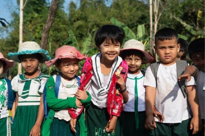 這是1月13日在皎漂縣中國援建學(xué)校拍攝的小學(xué)生。孩子們臉上涂著當(dāng)?shù)厝顺S玫奶烊环罆褡o(hù)膚品“特納卡”。新華社記者杜宇攝