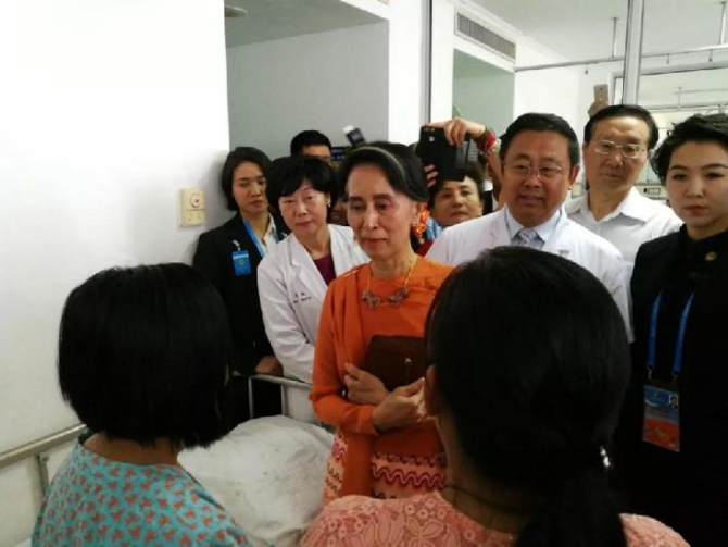 2017年5月16日,緬甸國務(wù)資政昂山素季來到北京安貞醫(yī)院看望受救助在京做手術(shù)的緬甸先心病患兒。她在北京出席首屆“一帶一路”國際合作高峰論壇。新華社記者李雪笛攝