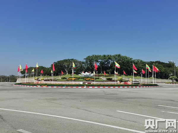 總統(tǒng)府不遠(yuǎn)處,雙向二十車(chē)道的寬闊馬路,馬路一端的環(huán)島掛上了中緬兩國(guó)的國(guó)旗(中央廣播電視總臺(tái)央廣記者 潘毅 攝)
