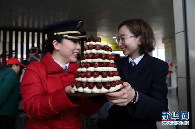 車站工作人員捧著親手做的棗糕,滿滿成就感