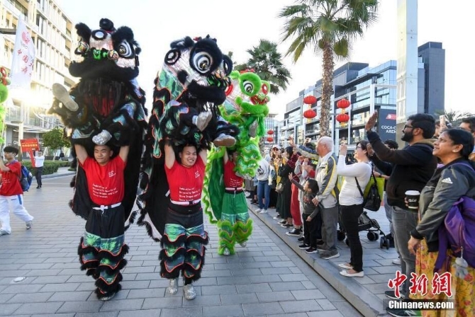 中國春節(jié),世界同慶。春節(jié)是中國民間最隆重盛大的傳統(tǒng)節(jié)日,近年來也日益成為一個全球性節(jié)日。這不,離春節(jié)還有幾天,“年味”就已經(jīng)在海外濃了起來。當?shù)貢r間1月17日,迪拜舉行2020“歡樂春節(jié)”大巡游,迎接即將到來的中國農(nóng)歷新年。街頭張燈結彩,中國大學生體育協(xié)會舞龍舞獅分會的大學生們揮舞著獅子與市民互動,迪拜市民則與華僑華人圍觀群獅共舞,現(xiàn)場還有國際友人身著中國傳統(tǒng)服飾抬花轎巡游。
