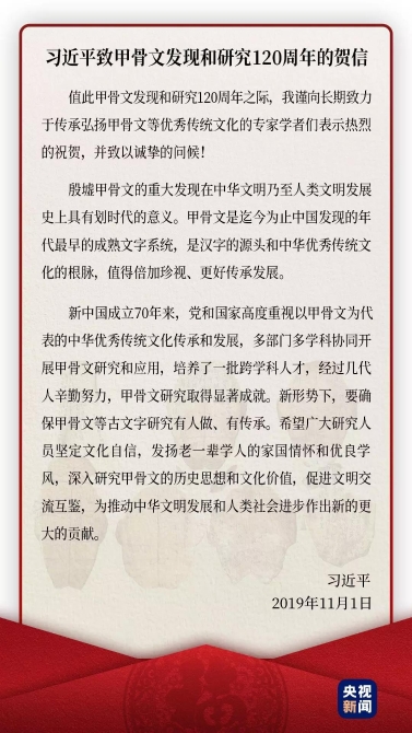 △2019年11月1日,習近平為甲骨文發(fā)現(xiàn)和研究120周年致賀信