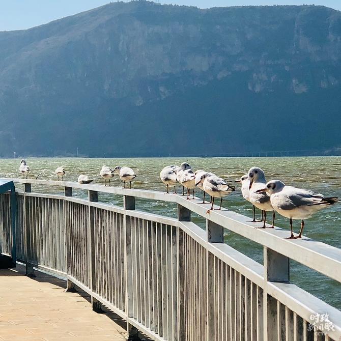 △海鷗臨時在滇池眺望臺休息,一片寧靜。(總臺央視記者彭漢明拍攝)