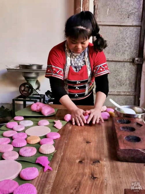△李發(fā)順一家正在制作節(jié)日傳統(tǒng)食品大米粑粑。(總臺央視記者史偉、央廣記者馬喆拍攝)