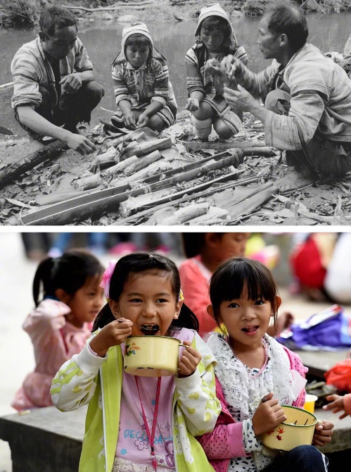從在河邊吃竹筒飯到學(xué)生的“免費午餐”,這兩張照片從飲食角度展現(xiàn)了基諾族生活條件的改善。