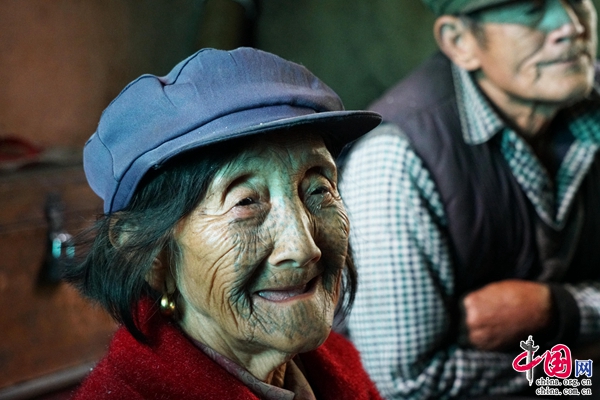 坐在火塘邊的肯國芳老人,寧靜而安詳,在她的臉上,紋滿了青藍色花紋。從眉心到下顎,圖案以鼻梁為中軸線向兩邊散去,對稱分布。仔細觀察,嘴唇下方的豎形紋修長,鼻梁中的圖案密集,清晰可見。