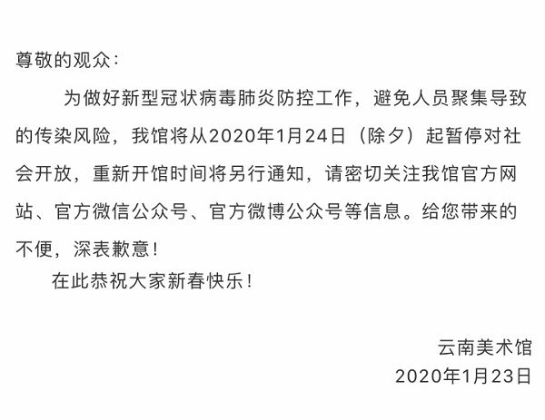 昆明信息港訊 1月24日,云南省美術(shù)館發(fā)布消息,為做好新型冠狀病毒肺炎防控工作,避免人員聚集導(dǎo)致的傳染風(fēng)險,云南省美術(shù)館將從1月24日起暫停對社會開放,重新開館時間將在官方網(wǎng)站、官方微信公眾號、官方微博公眾號等平臺另行通知。