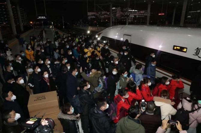 △18點50分,江蘇首批赴武漢支援的醫(yī)療團隊隊員陸續(xù)上車。