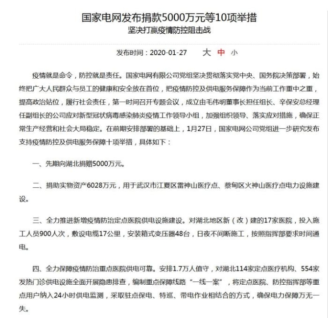 在前期安排部署的基礎(chǔ)上,1月27日,國家電網(wǎng)公司黨組進(jìn)一步研究發(fā)布支持疫情防控及供電服務(wù)保障十項舉措,具體如下: