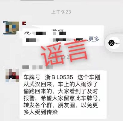 然而網(wǎng)上有關(guān)疫情的謠言也滿天飛……近日,有網(wǎng)友在本地微信群、朋友圈大量轉(zhuǎn)發(fā)“車牌號(hào)浙BL0535這個(gè)車剛從武漢回來(lái),車上的人確診了偷跑回來(lái)的,大家看到了及時(shí)報(bào)警,希望大家留意此車牌號(hào),轉(zhuǎn)發(fā)各個(gè)群,朋友圈,以免更多人受到傳染。”的信息。