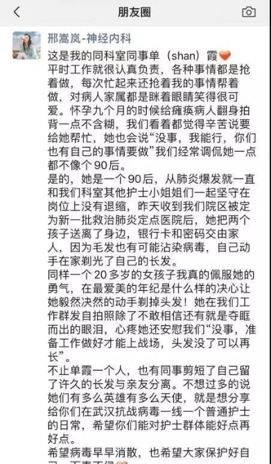1月26日晚,單霞在工作群中發(fā)了幾張自拍照,照片中的她穿著白大褂,笑對(duì)鏡頭,但頭頂已經(jīng)不再是一頭烏黑亮麗的秀發(fā),她把頭發(fā)剃光了。這幾張照片讓同事感動(dòng)不已。