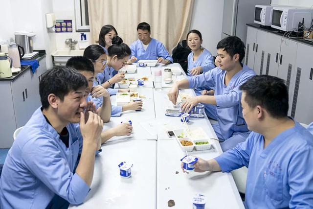 從隔離區(qū)出來,正好趕上夜班的醫(yī)護(hù)人員在吃飯,簡單的盒飯和酸奶,聽到他們的玩笑,我才意識(shí)到,這就是他們的年夜飯。十分鐘后,他們換裝上崗,在隔離病房里度過了今年的除夕夜。