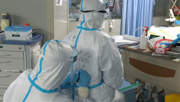 穿上隔離服的醫(yī)護(hù)人員只能露出一雙眼睛,誰也認(rèn)不出對(duì)方,于是他們進(jìn)入隔離區(qū)的第一件事,就是相互在隔離服上寫下對(duì)方的名字或者外號(hào),有時(shí)還會(huì)藝術(shù)創(chuàng)作一下,這成了隔離病房里“神秘的儀式”。