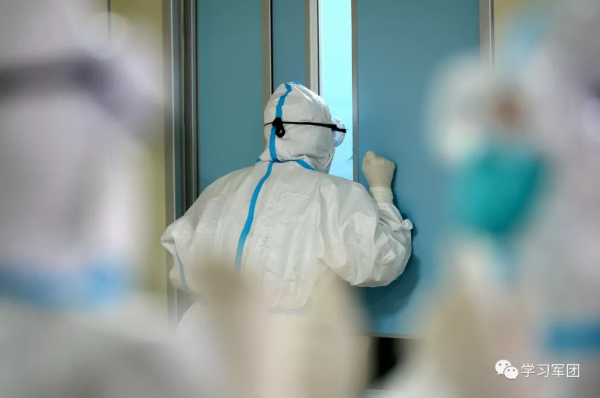 1月27日上午,海軍軍醫(yī)大學(xué)醫(yī)療隊(duì)醫(yī)護(hù)人員在漢口醫(yī)院重癥監(jiān)護(hù)室對新型冠狀病毒感染的肺炎患者進(jìn)行救治。醫(yī)護(hù)人員與監(jiān)護(hù)室外人員隔門交流。解放軍報(bào) 記者范顯海/攝