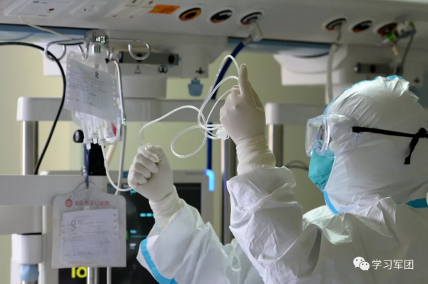 1月27日上午,海軍軍醫(yī)大學(xué)醫(yī)療隊(duì)醫(yī)護(hù)人員在漢口醫(yī)院重癥監(jiān)護(hù)室對新型冠狀病毒感染的肺炎患者進(jìn)行救治。醫(yī)護(hù)人員密切關(guān)注患者病情,根據(jù)變化調(diào)整輸液速度。解放軍報(bào) 記者范顯海/攝