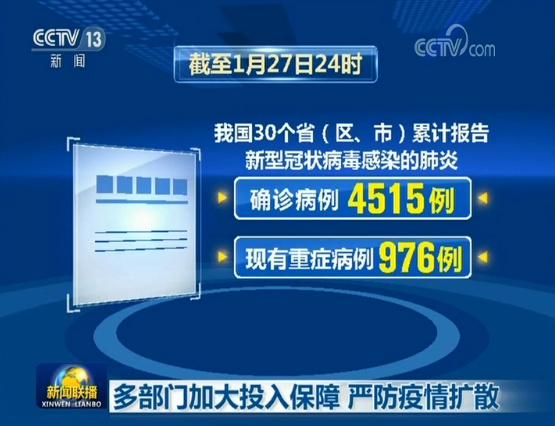 國(guó)家衛(wèi)生健康委通報(bào):截至1月27日24時(shí),我國(guó)30個(gè)省(區(qū)、市)累計(jì)報(bào)告確診病例4515例,現(xiàn)有重癥病例976例,累計(jì)死亡病例106例,累計(jì)治愈出院60例?,F(xiàn)有疑似病例6973例。