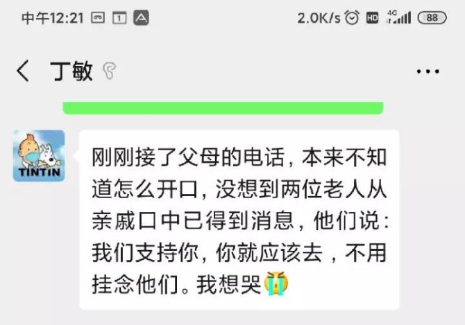 山東省立醫(yī)院ICU護(hù)理專業(yè)護(hù)士長(zhǎng)丁敏申請(qǐng)赴前線后,一直不知如何告知年邁的父母。然而父母的一通電話,讓丁敏淚流滿面:“剛剛接了父母的電話,本來(lái)不知道怎么開(kāi)口,沒(méi)想到兩位老人從親戚口中已得到消息,他們說(shuō):我們支持你,你就應(yīng)該去 ,不用掛念他們。聽(tīng)完他們的話我想哭……”