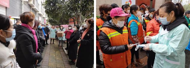 成都市郫都區(qū)的巾幗志愿者放棄春節(jié)休假,到各街道(鎮(zhèn))、村(社區(qū))發(fā)放宣傳資料、防護(hù)用品。