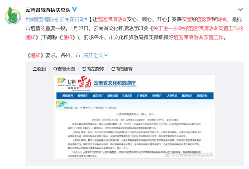 妥善安置好疫區(qū)滯留游客,是抗擊疫情的重要一役。1月27日,云南省文化和旅游廳印發(fā)《關(guān)于進一步做好疫區(qū)滯滇游客安置工作的通知》,要求各州、市文化和旅游局抓實抓細(xì)抓好疫區(qū)滯滇游客安置工作,讓疫區(qū)滯滇游客安心、順心、開心。