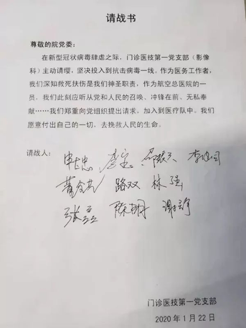 年近八旬的黃錫璆博士,還第一時(shí)間向組織遞交了請(qǐng)戰(zhàn)書(shū),表達(dá)了作為共產(chǎn)黨員、愿隨時(shí)聽(tīng)從組織安排,趕赴一線,參加疫情抗擊工作的決心。他寫(xiě)道:“本人是共產(chǎn)黨員,與其他年青同事相比家中牽掛少,具有非典小湯山實(shí)戰(zhàn)經(jīng)驗(yàn)。本人向組織表示,隨時(shí)聽(tīng)從組織召喚,隨時(shí)準(zhǔn)備突擊參加抗擊工作?!?/p>