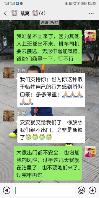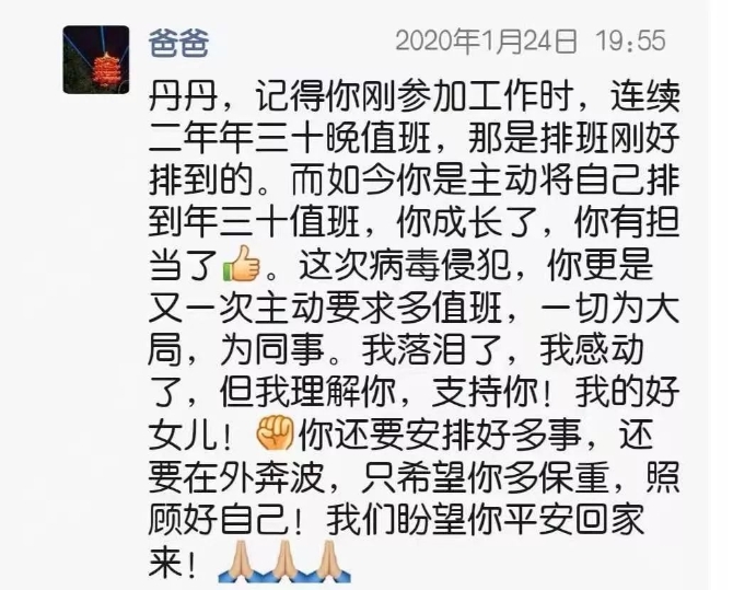 劉海生在微信群里發(fā)過(guò)這樣一段感言:“老婆和孩子春節(jié)都在醫(yī)院參加抗戰(zhàn)疫情,心里壓力好大!給自已和家人默默的鼓個(gè)勁,加個(gè)油。我們一定會(huì)平安的渡過(guò)疫情危機(jī),抗戰(zhàn)一定會(huì)取得勝利!祝家人安好,祝同學(xué)們安好,祝全國(guó)人民安好!對(duì)抗疫情!”