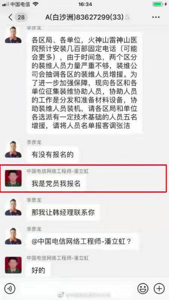 火神山、雷神山醫(yī)院需要安裝幾百部電話。中國(guó)電信征集志愿者,從各區(qū)抽調(diào)人員,增強(qiáng)前線保障力量。通知?jiǎng)倓偘l(fā)出,在工作群里出現(xiàn)了這樣一句熟悉的話:我是黨員我報(bào)名。