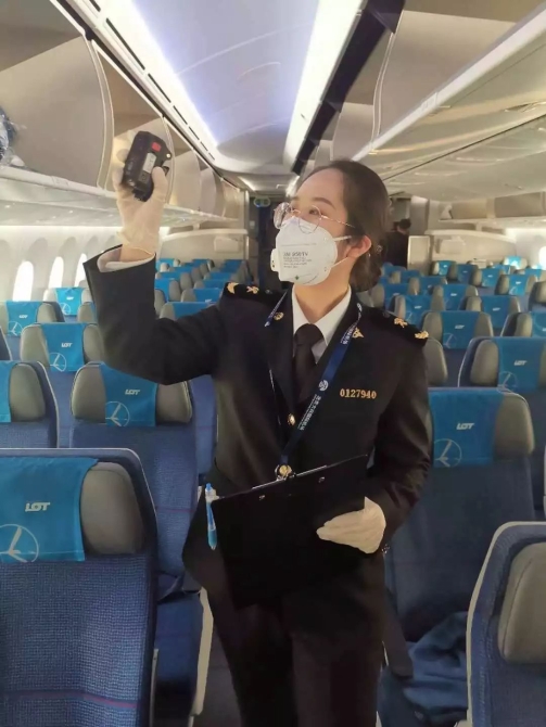 旅檢二科周澗柔對(duì)航空器進(jìn)行登機(jī)清艙檢查。