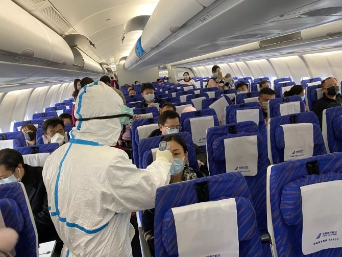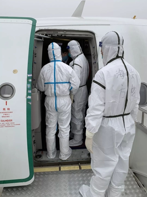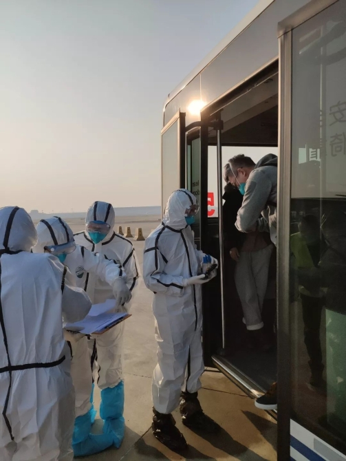 海關(guān)工作人員對(duì)出境航班申報(bào)有癥狀人員在遠(yuǎn)機(jī)位開(kāi)展醫(yī)學(xué)排查。