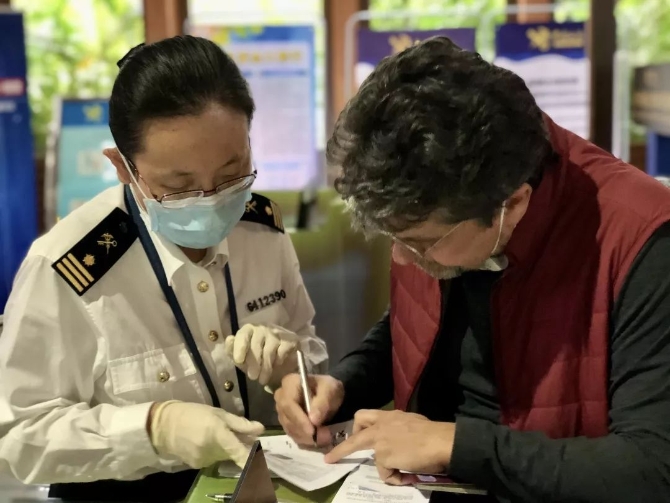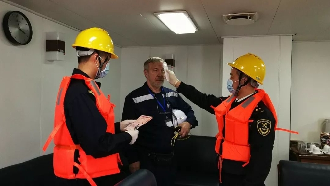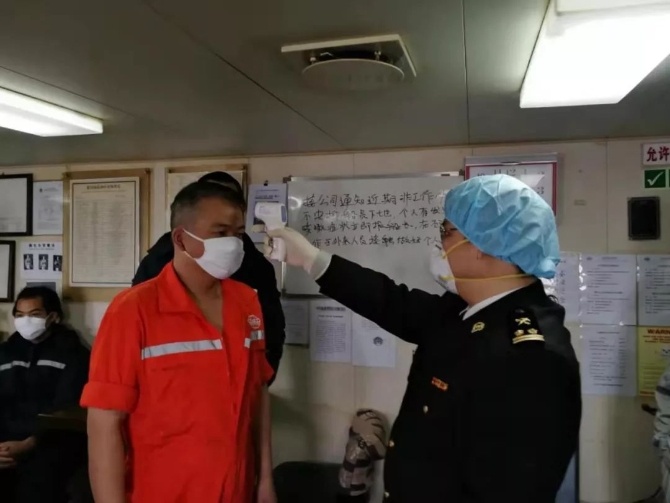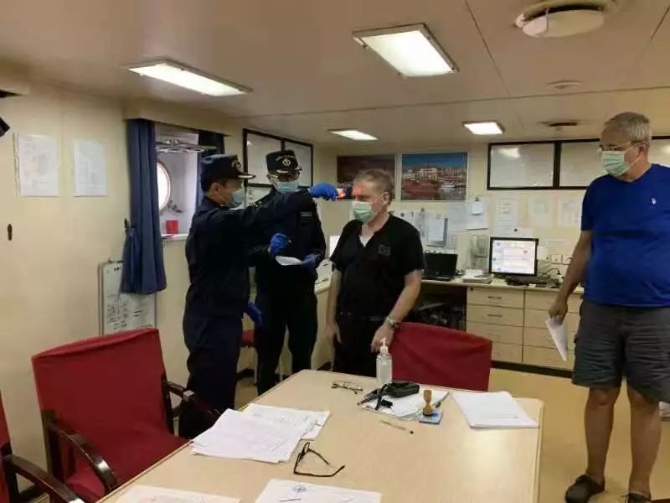 關(guān)員吳顯成、張竣嚴(yán)格落實(shí)疫情防控應(yīng)對(duì)措施,強(qiáng)化登輪檢查和衛(wèi)生檢疫工作。