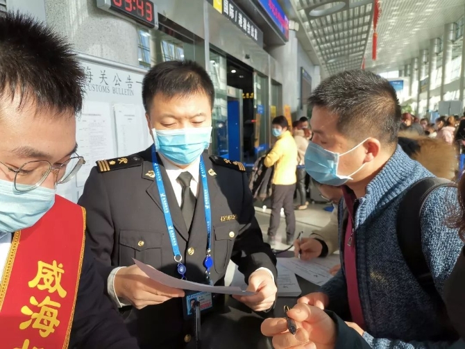 現(xiàn)場(chǎng)關(guān)員陸宇、文黎興正在對(duì)入境的旅客進(jìn)行體溫監(jiān)測(cè)。