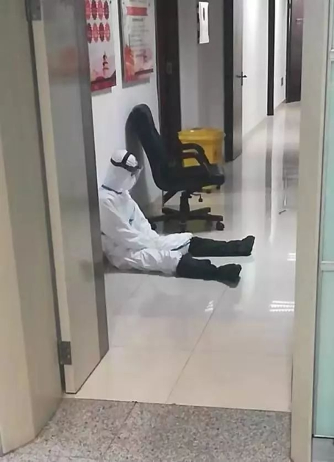 長(zhǎng)沙黃花機(jī)場(chǎng)國(guó)際出發(fā)醫(yī)學(xué)排查室走廊,關(guān)員王勃維在連續(xù)5個(gè)小時(shí)醫(yī)學(xué)排查后坐在地上休息片刻馬上又投入工作崗位。