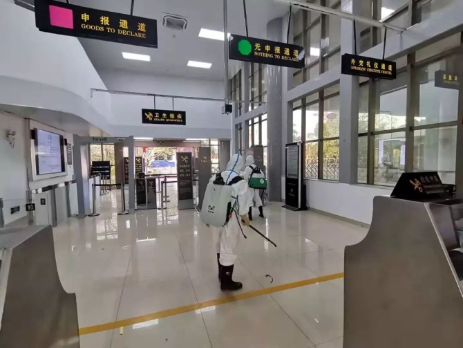 衛(wèi)生檢疫工作人員劉寧、農(nóng)華秋在醫(yī)學(xué)排查后對(duì)監(jiān)管現(xiàn)場(chǎng)進(jìn)行終末消毒。