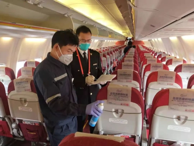 ??诿捞m機(jī)場(chǎng)海關(guān)關(guān)員唐盛俊登臨航空器監(jiān)督衛(wèi)生處理工作。