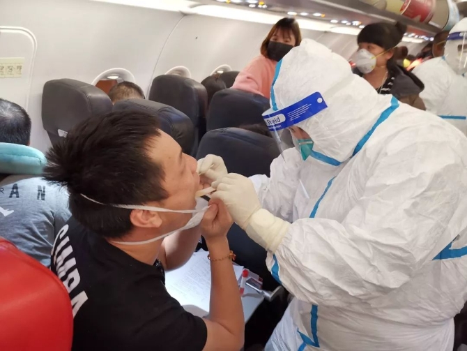 保健中心實(shí)驗(yàn)室技術(shù)人員周筱正對(duì)來(lái)自泰國(guó)的旅客進(jìn)行采樣。