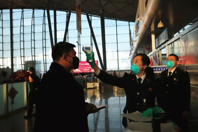 海關(guān)關(guān)員李玲對(duì)出境旅客進(jìn)行嚴(yán)格體溫排查。