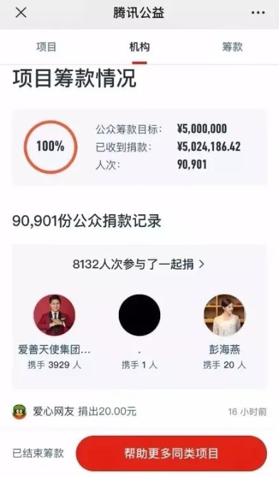 湖南省婦聯(lián)、省婦女兒童基金會(huì)聯(lián)合騰訊公益平臺(tái)發(fā)起眾籌,5個(gè)小時(shí)籌集了500萬元。