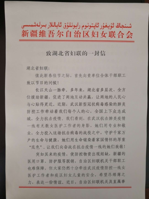 新疆維吾爾自治區(qū)婦聯(lián)也組織新疆姐妹捐款。