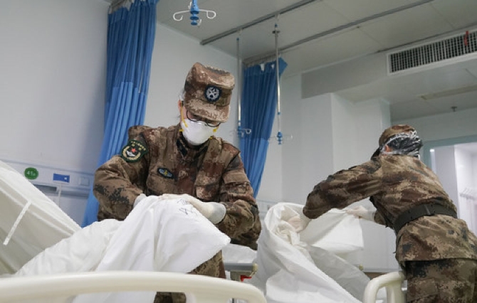 ↑1月26日,陸軍軍醫(yī)大學醫(yī)療隊在武漢市金銀潭醫(yī)院接管病區(qū)清理病房。新華社記者 程敏 攝