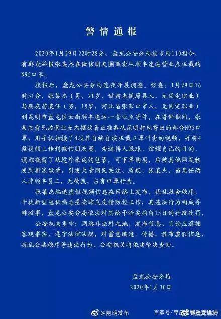 接報(bào)后,盤(pán)龍公安分局連夜開(kāi)展調(diào)查。經(jīng)查,1月29日16時(shí)31分,張某杰(男,21歲,甘肅省鎮(zhèn)原縣人,無(wú)固定職業(yè))與朋友苗某任(男,18歲,河北省張家口市人,無(wú)固定職業(yè))到昆明市盤(pán)龍區(qū)云南順豐速運(yùn)一營(yíng)業(yè)點(diǎn)寄件。在寄件期間,張某杰看見(jiàn)該營(yíng)業(yè)點(diǎn)內(nèi)擺放著正準(zhǔn)備從昆明打包寄出的部分 N95口罩,用手機(jī)拍攝了4 段其自編自演攔截口罩叫賣(mài)的視頻,并將段視頻上傳到微信朋友圈,為達(dá)博人眼球、炫耀自己的目的謊稱(chēng)截留了從境外來(lái)昆的包裹,可下單購(gòu)買(mǎi),后被其他網(wǎng)友轉(zhuǎn)發(fā)到新浪徽博,引發(fā)大量網(wǎng)民關(guān)注、質(zhì)疑。張某杰、苗某任兩人非順豐員工,無(wú)截獲、占有口罩行為。