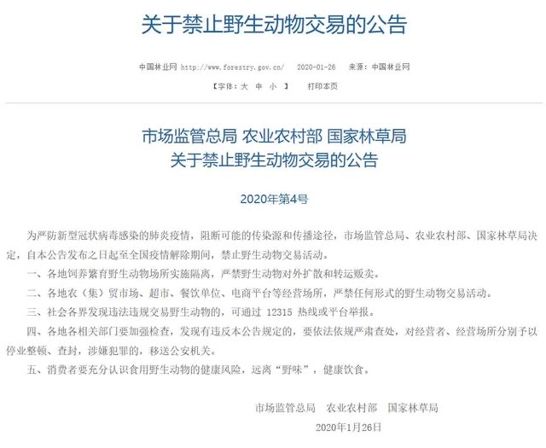 為此,國家市場監(jiān)管總局、農(nóng)業(yè)農(nóng)村部、國家林業(yè)和草原局26日聯(lián)合發(fā)布公告要求,即日起至全國疫情解除期間,禁止野生動物交易活動,以斬斷病毒的傳染源和傳播途徑。