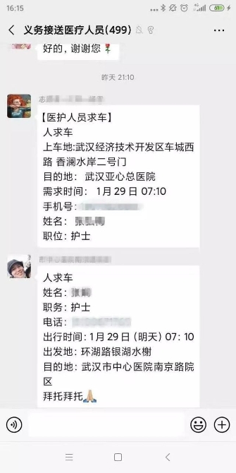 我們的工作流程一般就是,群里醫(yī)護(hù)人員按格式發(fā)布用車信息,車主根據(jù)自己的情況聯(lián)系,群管理人員會定期將還未聯(lián)絡(luò)好的醫(yī)護(hù)人員用車情況在群里廣播。還有些物資需要我們運(yùn)輸?shù)?,也會在群里征召司機(jī)車輛,比如義務(wù)送餐、醫(yī)護(hù)物資等。