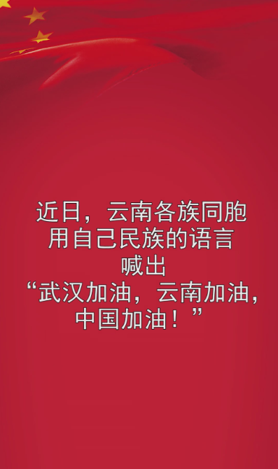 “武漢加油,云南加油,中國加油!”兄弟同心,其利斷金。新型冠狀病毒感染的肺炎疫情牽動(dòng)著云南各族群眾的心,由學(xué)習(xí)強(qiáng)國云南學(xué)習(xí)平臺(tái)、云南網(wǎng)錄制的云南各族群眾民族語加油視頻,喊出了4800萬云南各族兒女?dāng)y起與全國人民一道眾志成城,團(tuán)結(jié)一心,誓要戰(zhàn)勝新型冠狀病毒感染的肺炎疫情的信心和決心。(云南網(wǎng) 記者趙瑋 趙黎浩)