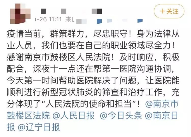 ——這是1月26日大年初二,一位案件代理人發(fā)的一條微博留言。原來(lái)25日深夜,鼓樓區(qū)法院值班干警接到了一位代理人提出可否立即解封賬戶(hù)的申請(qǐng)。法官經(jīng)核實(shí)該醫(yī)院急需采購(gòu)相關(guān)醫(yī)療設(shè)備的事實(shí)及材料,并第一時(shí)間聯(lián)系原告后,原告表示充分理解,法官依法進(jìn)行了遠(yuǎn)程解封,確保該醫(yī)院新冠肺炎篩查治療工作得以順利進(jìn)行。