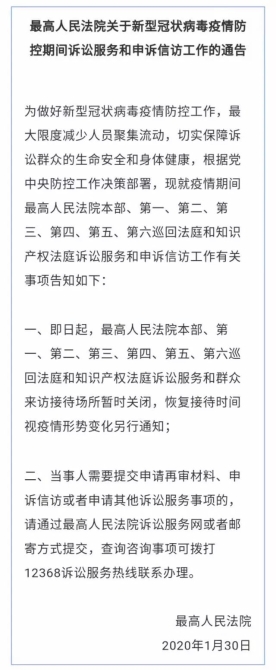 1月30日,最高人民法院發(fā)布關(guān)于新型冠狀病毒疫情防控期間訴訟服務(wù)和申訴信訪工作的通告。