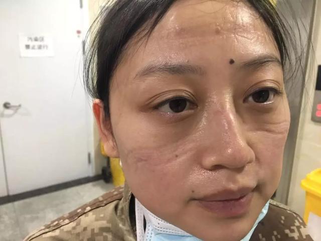 脫下防護服后,臉上被護目鏡和面屏壓出的印痕。