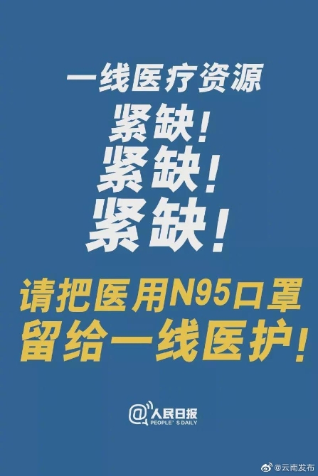昆明信息港訊 機(jī)器人小明 【緊急呼吁!請把醫(yī)用N95口罩留給一線醫(yī)護(hù)】工信部消費(fèi)品工業(yè)司副司長曹學(xué)軍2月2日在新聞發(fā)布會上說,N95口罩是指過濾效率達(dá)到95%標(biāo)準(zhǔn)的口罩,分為工業(yè)防塵和醫(yī)用兩類,以醫(yī)用N95口罩防護(hù)更高。國內(nèi)目前口罩產(chǎn)能每天超1000萬只,可用于隔離病房等地的醫(yī)用N95口罩每天產(chǎn)能60萬只。(人民日報(bào))