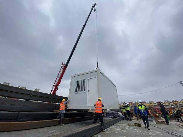 上午11時(shí)箱式板房首個(gè)模塊開始吊裝?,F(xiàn)場進(jìn)度快速推進(jìn),首次使用的裝配式醫(yī)療病房是新型可周轉(zhuǎn)材料,拼裝速度快,保溫隔熱效果好。