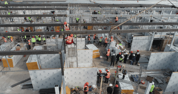 下午16時(shí),中建三局等全部完成現(xiàn)場場地平整和回填,板房基礎(chǔ)混凝土澆筑完成約90%,完成300多個(gè)箱式板房骨架安裝,同時(shí)場外抓緊板房拼裝,完成約400個(gè),吊至現(xiàn)場直接安裝。水電暖通、機(jī)電設(shè)備等材料全面到位,同步開始作業(yè)。