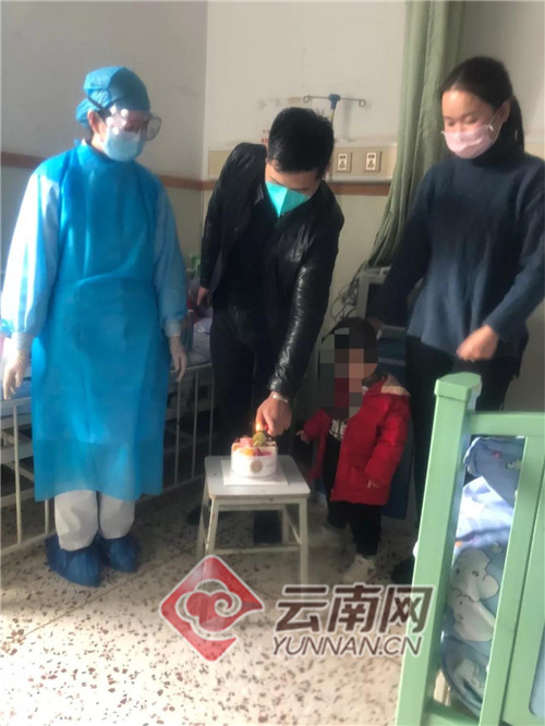 1月31日,一個(gè)簡(jiǎn)單但特別有意義的生日會(huì)在昆明市兒童醫(yī)院書林院區(qū)的隔離病房舉行。在祝福聲中,來自武漢的小征(化名)和父母一起吹滅了2歲生日蛋糕上的蠟燭!